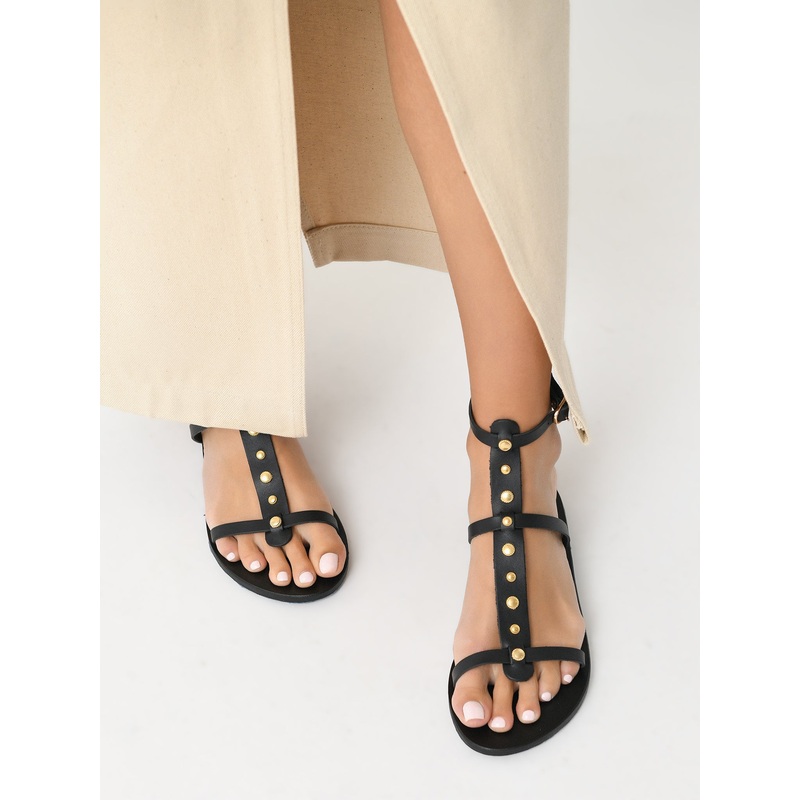 DESCRIPTION:A strappy leather sandal with embellished details and an adjustable ankle strap.FEATURES:Round ToeAdjustable Ankle StrapEmbellished DetailsFlat SoleLeather/RubberHandmade in Greece