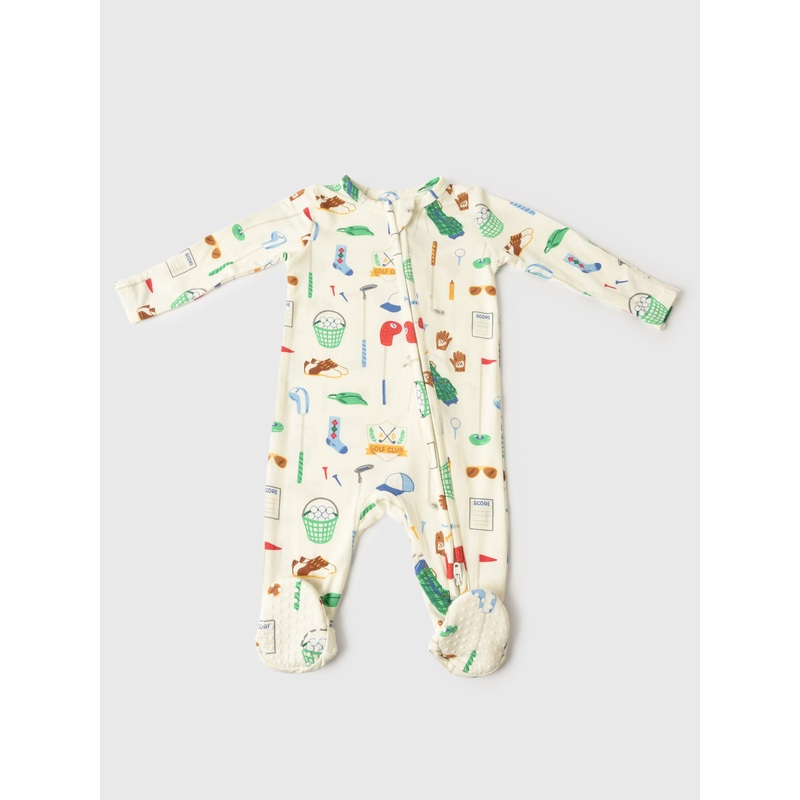 A signature footie pajama made from breathable fabric with a convenient two-way zip closure and custom golf-inspired print.