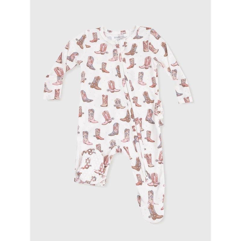 DESCRIPTION:This cozy zipper footie is crafted from ultra-soft bamboo viscose fabric and features a charming cowgirl boot print with adorable ruffle detailing for the perfect blend of comfort and cuteness.FEATURES:Round NecklineFoldover Cuffs for NB to 6-9