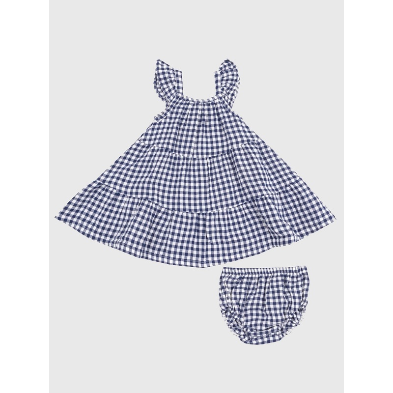 A sundress and diaper cover set crafted from breathable cotton muslin featuring a gingham print and a flowy skirt.