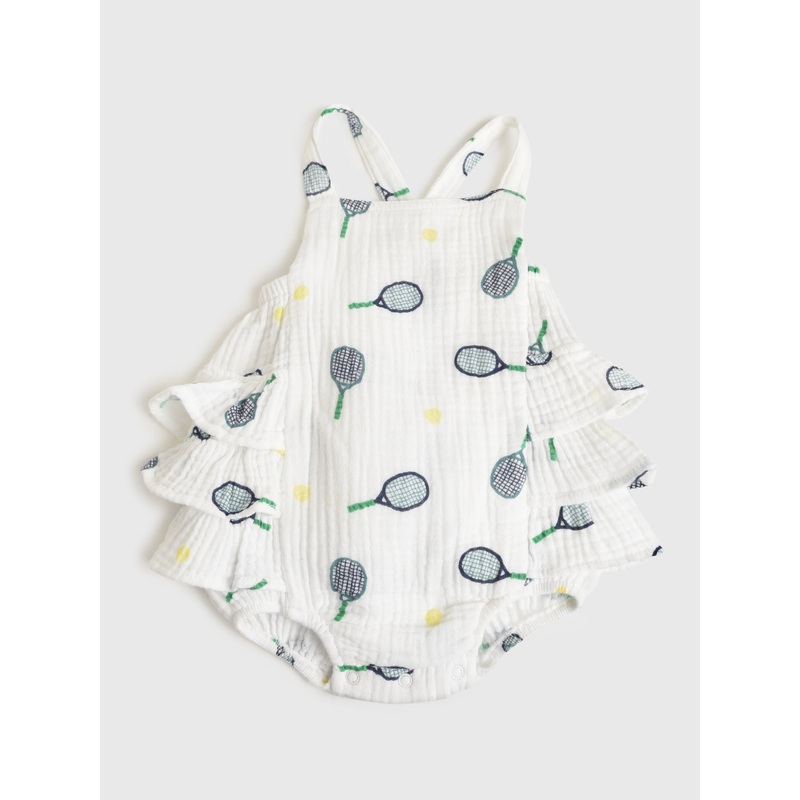 DESCRIPTION:A soft sunsuit made from breathable cotton muslin fabric featuring sweet ruffle detailing and a fun tennis print. FEATURES:Square NecklineAdjustable StrapsRuffle TrimsSnap ClosureAll-Over Novelty Print100% CottonClassic Fit
