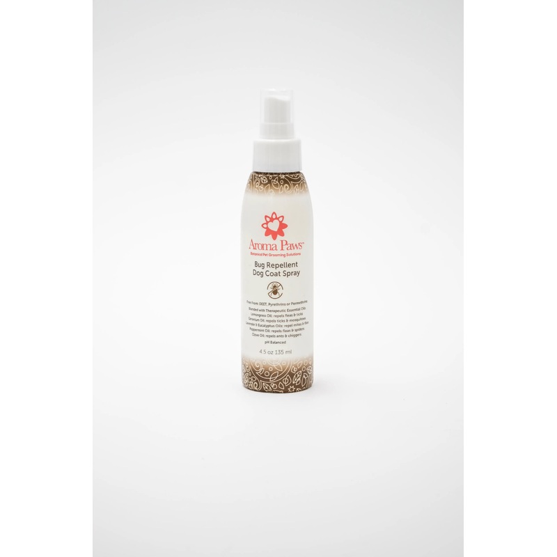 Aroma Paws Bug Repellent SprayAroma Paws Bug Repellent Dog Coat Spray has been formulated to be effective in repelling bugs, yet sensitive to your dog's olfactory systemContains NO: DEET, Pyrethrins, or Permethrins.Use this natural deterrent on dog coat, i
