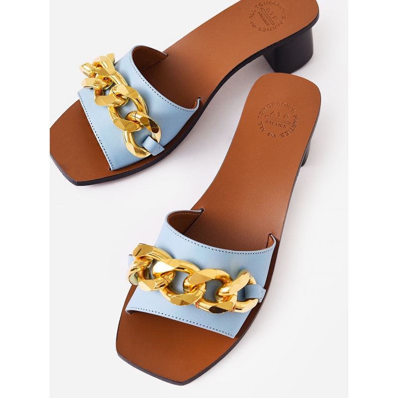 DESCRIPTION:A leather sandal with a chunky chain detail and stacked heel.FEATURES:Open ToeWide StrapChunky Chain DetailVacchetta LeatherHeel Height: 2 in.