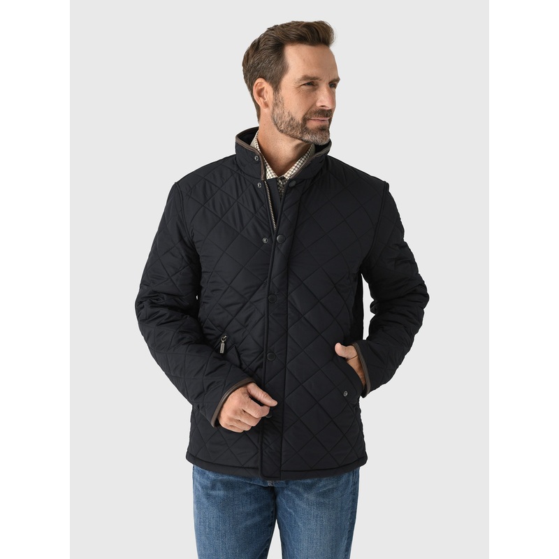 DESCRIPTION:A diamond-quilted jacket with lightweight synthetic insulation and finished with leather trims.FEATURES:Stand-Up CollarSide Zip Pockets, Snap PocketsFull Zip Closure, Snap PlacketLeather TrimsDiamond Quilted DesignShell: 100% Polyester | Fill: