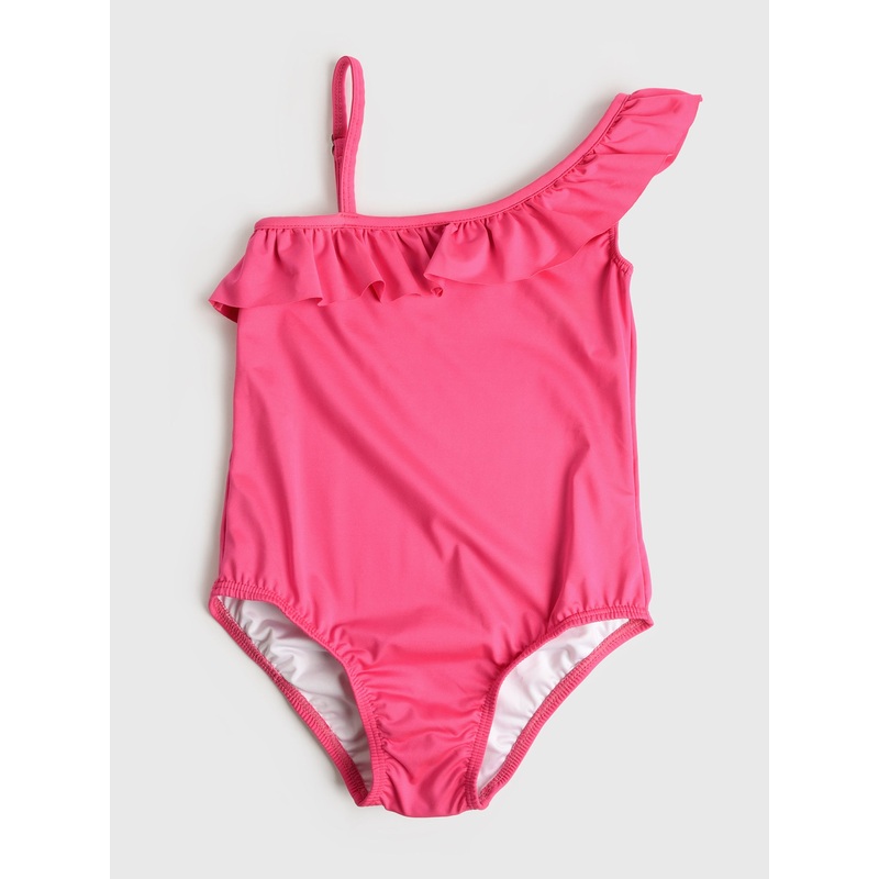DESCRIPTION:This classic one-piece swimsuit features a one-shoulder design, ruffle trim, and full coverage.FEATURES:One Shoulder NecklineThin, Adjustable StrapRuffle TrimFull CoveragePolyester BlendClassic Fit