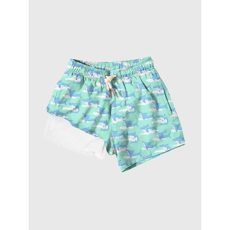 This lightweight and stretchy swim trunk is made from sun-protective fabric and features a custom shark print.