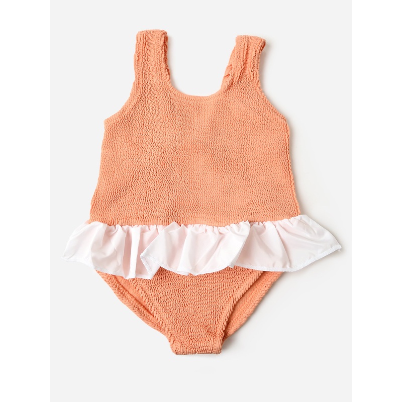 DESCRIPTION:A one-piece swimsuit made from high-stretch crinkle fabric with a contrast ruffle skirt.