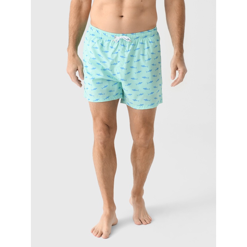 DESCRIPTION:A lightweight and breathable swim trunk made from sun-protective material with a custom shark print.FEATURES:Elastic WaistbandAdjustable DrawstringSide Pockets, Back PocketMesh LinerAll-Over Novelty PrintInseam: 5.5 in.4-Way StretchQuick-Drying