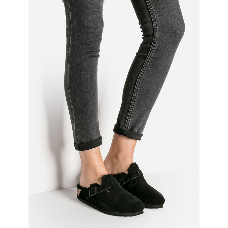 DESCRIPTION:Suede clog with exceptionally cozy shearling lining.FEATURES:Adjustable BuckleRound ToeAnatomically Shaped FootbedUpper: SuedeLining: ShearlingFootbed: CorkSole: EVANarrow Fit