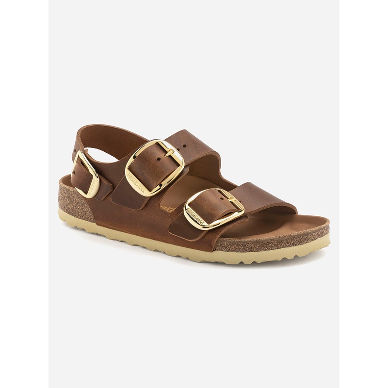 Oiled nubuck leather sandal with a lived-in look featuring oversized gleaming buckles.