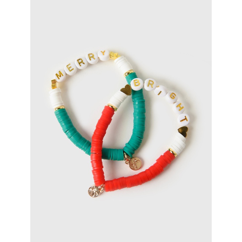 DESCRIPTION:Let the holiday fun begin! This festive bracelet set is sure to delight any little girl. The adorable designs and beautiful packaging make it a perfect gift.FEATURES:Set of 2 BraceletsStretch FitMaterial: Clay Beads, Metal & Plastic
