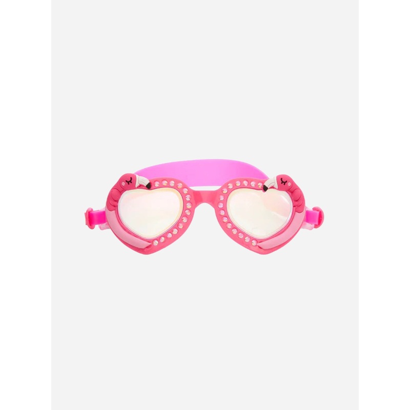 Heart-shaped swim goggle with flamingo motifs and rhinestone accents.