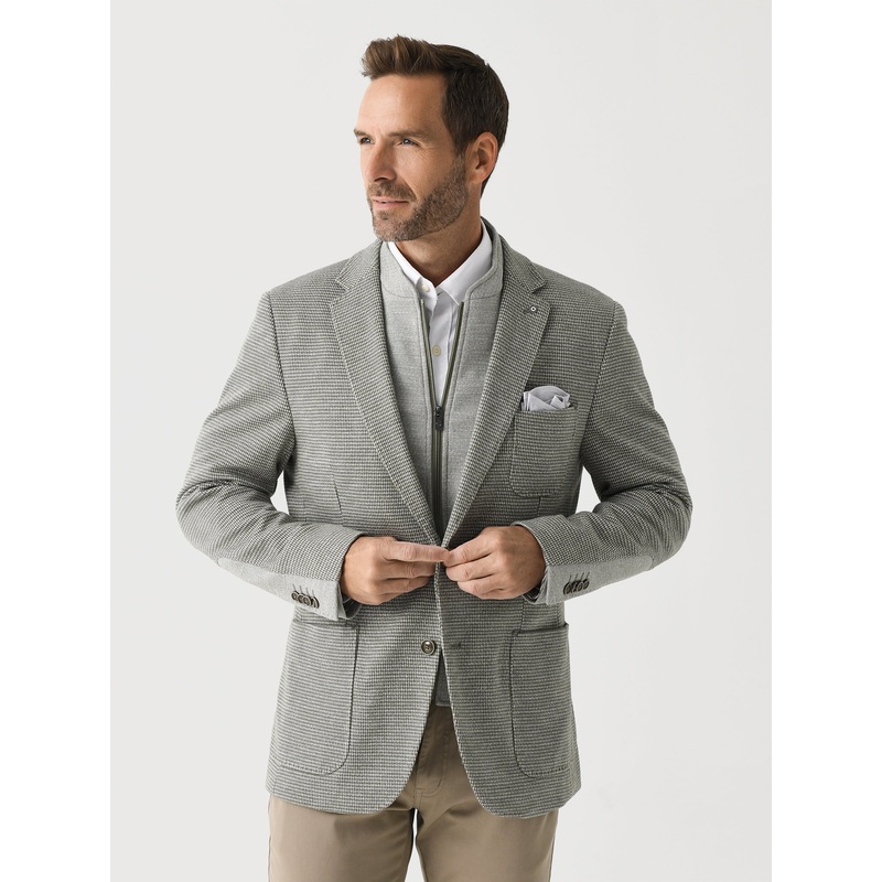 DESCRIPTION:This comfortable blazer is made from woven stretch fabric and features classic detailing with an inner zip closure.FEATURES:Notch LapelLeft Chest PocketIncludes Pocket SquarePatch PocketsInner Zip ClosureDouble Button ClosureTextured Fabricatio