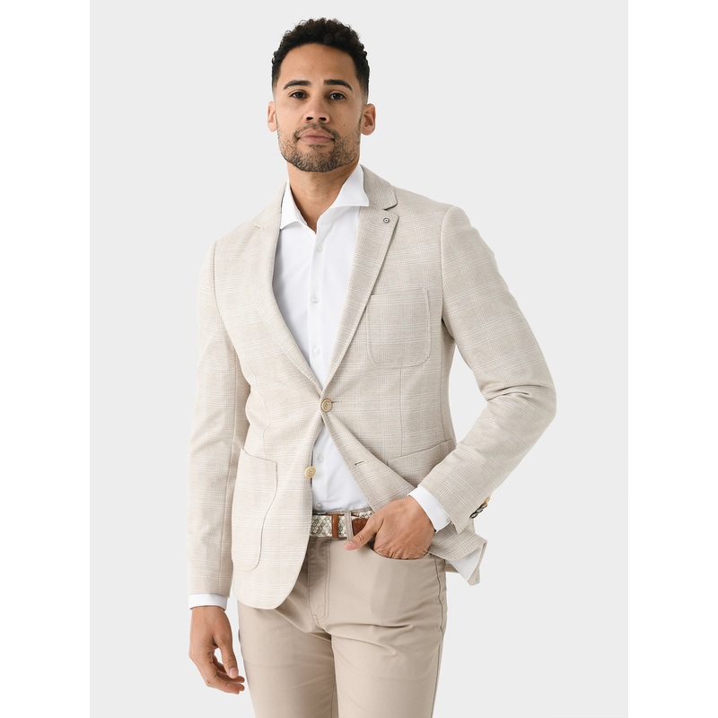Tailored blazer made from woven stretch fabric with a subtle plaid print.