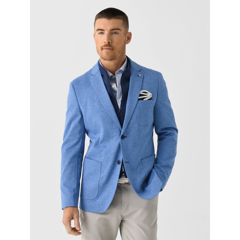 DESCRIPTION:This comfortable blazer is made from stretch knit fabric and features classic detailing with an inner zip closure.FEATURES:Notch LapelsLeft Chest PocketIncludes Pocket SquarePatch PocketsInner Zip ClosureDouble Button ClosureStretch Blend Fabri
