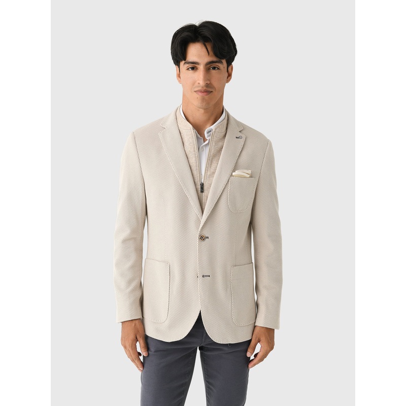 DESCRIPTION:A comfortable blazer made from textured woven fabric and finished with classic detailing and an interior zip closure.FEATURES:Notch LapelsLeft Chest PocketIncludes Pocket SquarePatch PocketsInner Zip ClosureDouble Button ClosureKnit Fabrication