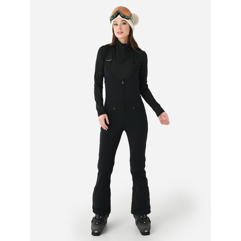 A triple-layer softshell ski bib with quilted knee sections, shaped seams, and a soft fleece reverse.