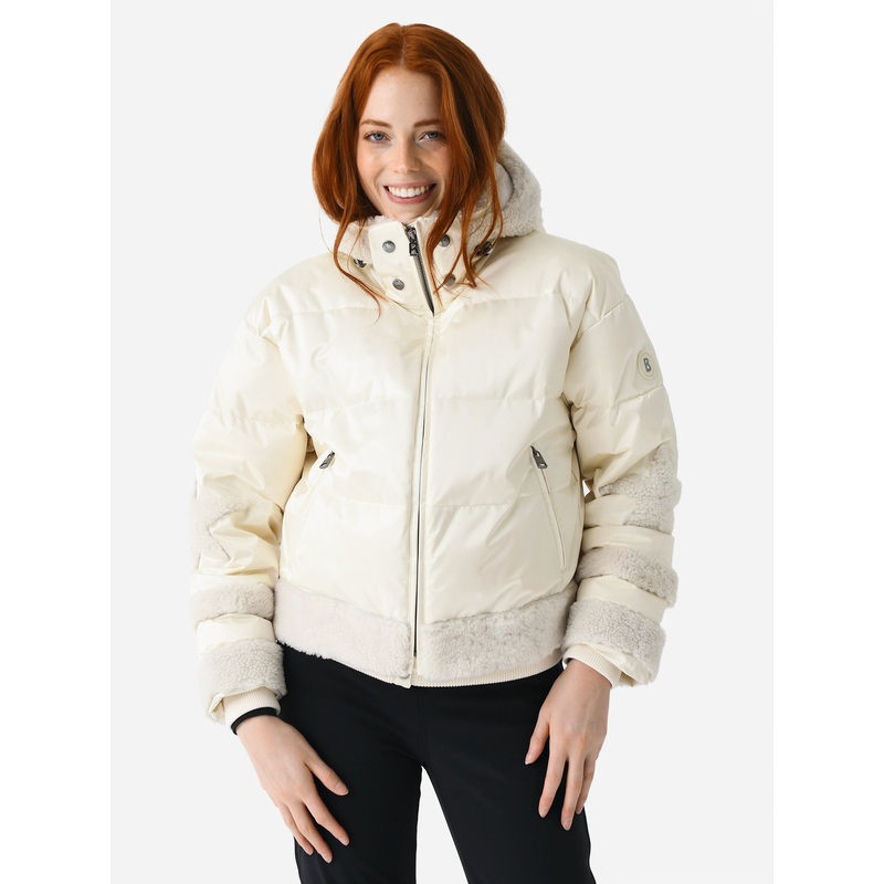 A down-quilted ski jacket featuring sherpa trims and star motifs.