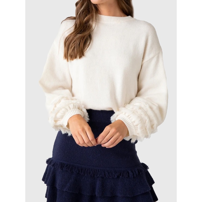 DESCRIPTION:A loose-fitting sweater featuring voluminous balloon sleeves and stacked fringe details.FEATURES:Crew NecklineDropped ShoulderBalloon SleevesFringe TrimsRibbed Neckline, Cuffs and HemKnit Fabrication42% Acrylic, 30% Polyester, 28% NylonClassic