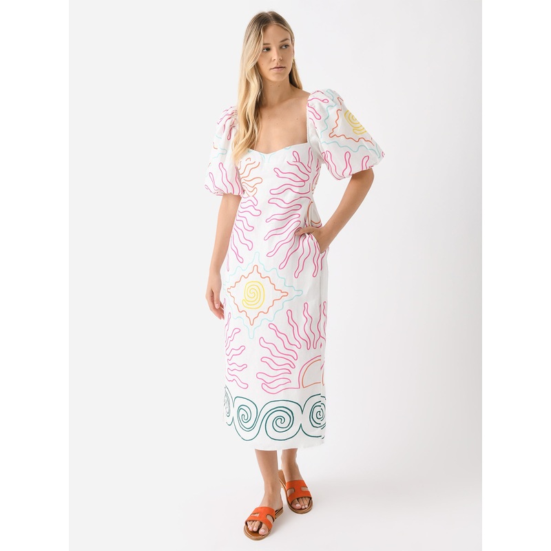 DESCRIPTION:A lightweight linen dress with voluminous puff sleeves, a fitted bodice, and a colorful summer-ready oasis print.FEATURES:Sweetheart NecklinePuff SleevesSmocked BackSide PocketsMidi SilhouetteAll-Over Novelty Print100% LinenClassic FitModel is