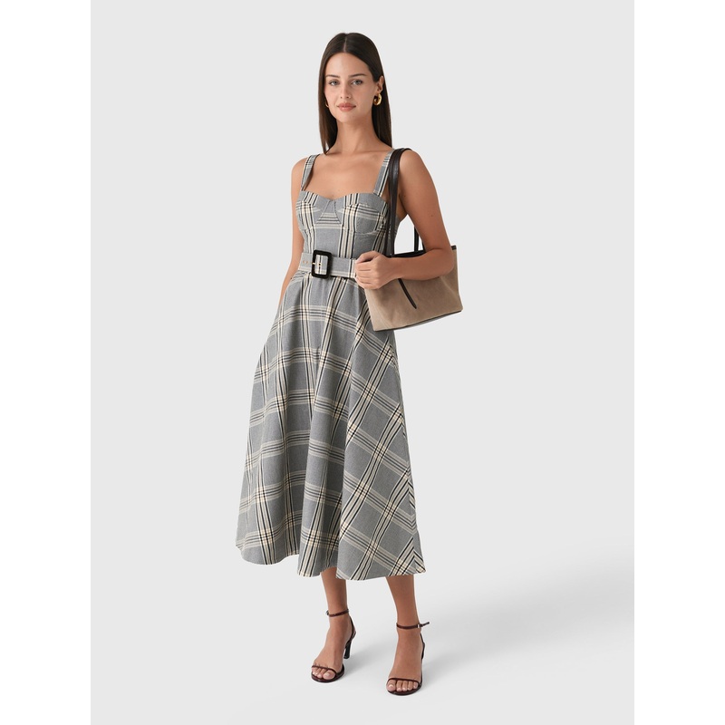 This mid-length dress features a fit-and-flare design with a bustier bodice supported by side boning. The wide, removable belt cinches at the waist for a flattering silhouette.