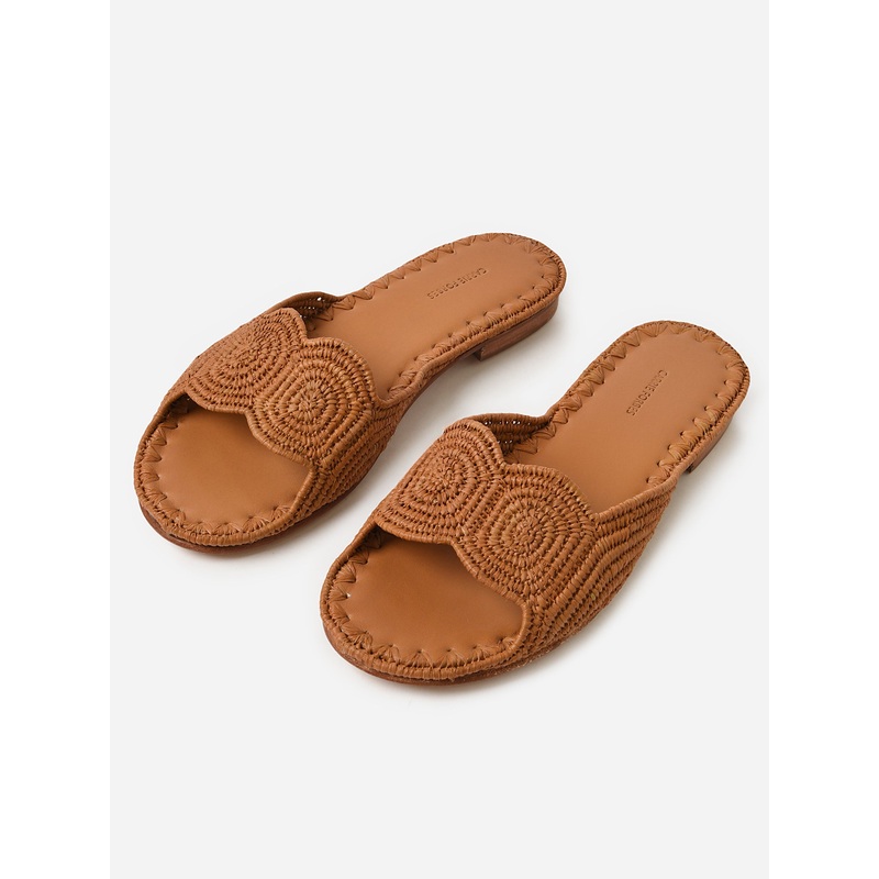 DESCRIPTION:A flat, slide sandal made from handwoven raffia.