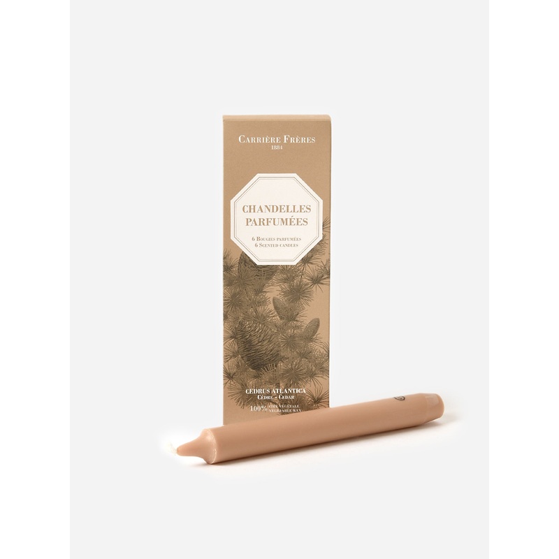 A set of six taper candles with a comforting cedar scent.