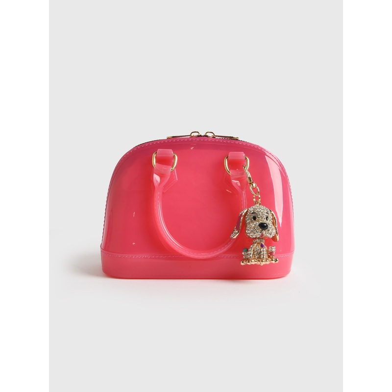 DESCRIPTION:This adorable handbag features a bright pink color and playful puppy charm making it a fun and stylish accessory for any occasion.FEATURES:Zip ClosureCharm DetailPlastic Jelly MaterialDimensions: 7 in. x 5.5 in. x 3.5 in.Weight: 11 oz.