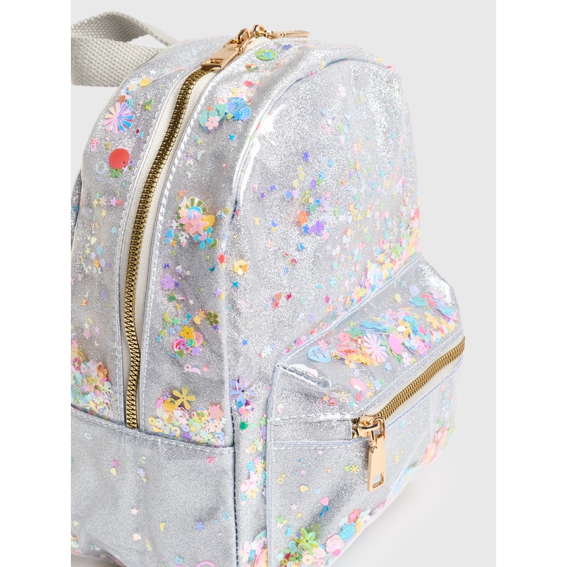 This joyful backpack is made from a shimmery glitter fabric and filled with colorful confetti with a comfortable, lightweight design.