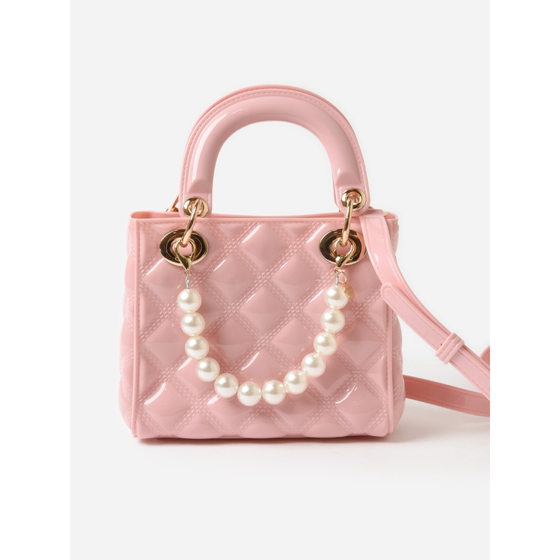 DESCRIPTION:A medium-sized children's purse made from quilted jelly material with a pearl detail and optional crossbody strap.FEATURES:Open TopPearl DetailDetachable StrapQuilted Jelly MaterialDimensions: 7 in. x 6 in. x 3 in.