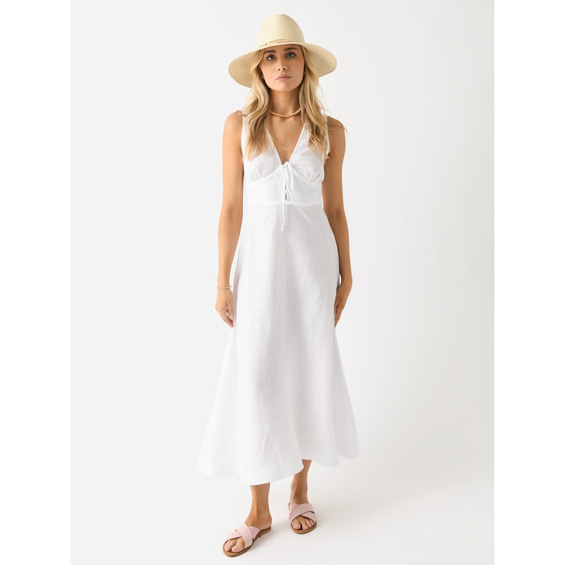 DESCRIPTION:A timeless dress made from organic linen with a flattering v-neckline and A-line silhouette.FEATURES:V-NecklineSelf-Tie KeyholeSleevelessBack Zip ClosureMidi LengthA-Line Silhouette100% Organic LinenClassic FitModel is wearing size Small dress.