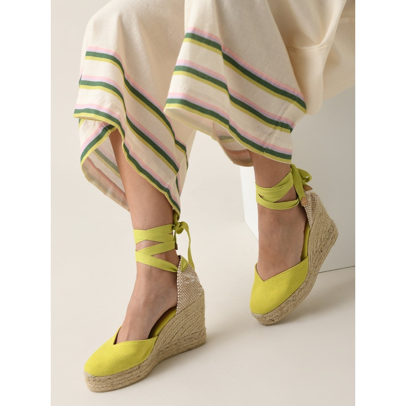 A warm-weather-ready espadrille-style wedge made from cotton canvas with a braided jute heel.