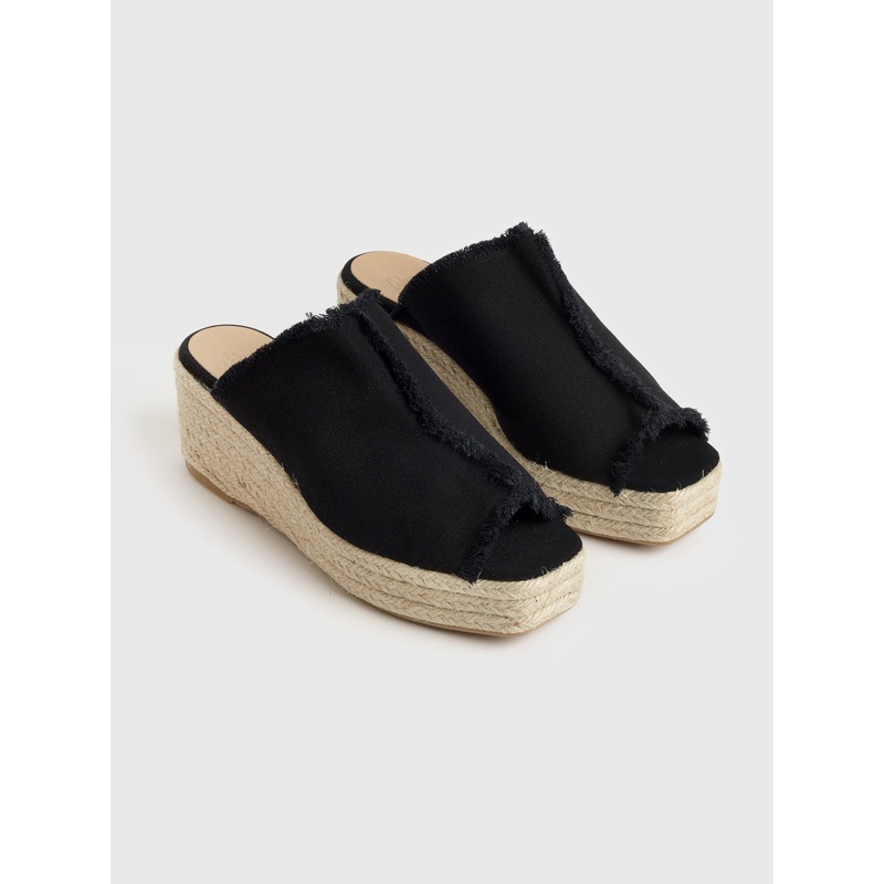 DESCRIPTION:This modern take on a classic wedge features a canvas upper with stylish frayed edges and a jute heel for effortless sophistication.FEATURES:Peep ToeCotton Canvas UpperFrayed TrimsBraided Jute HeelVulcanized Rubber SoleEspadrille StyleHeel Heig