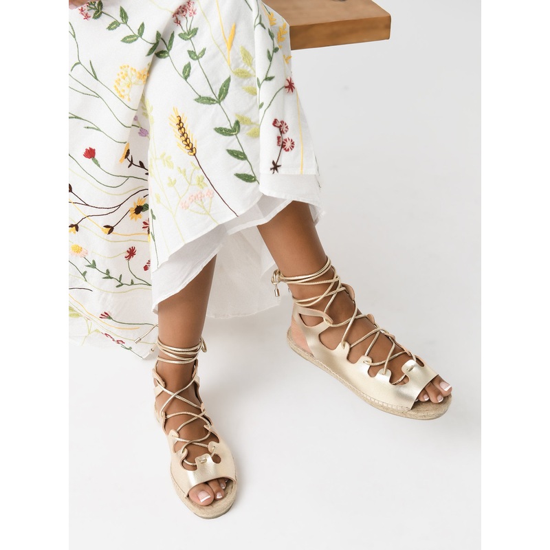 An espadrille-style gladiator sandal handmade from metallic leather with self-tie ankle straps.