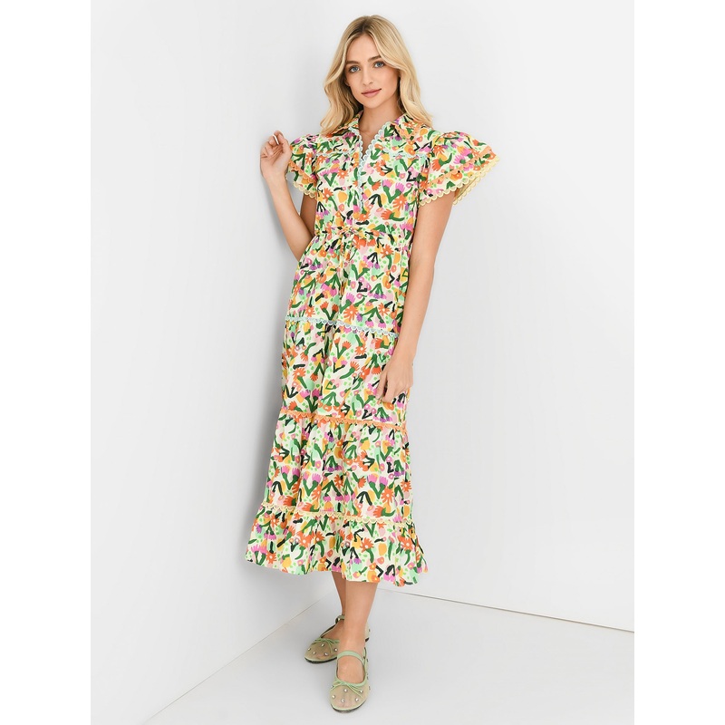 DESCRIPTION:A colorful printed mid-length shirt-style dress with an adjustable waist and scalloped trims throughout.FEATURES:Spread CollarRuffle SleevesButton-Down FrontSelf-Tie WaistTiered SkirtScalloped TrimsAll-Over Novelty Print72% Cotton, 25% Recycled