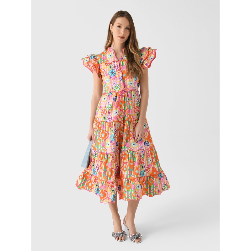 DESCRIPTION:This vibrant dress is a celebration of color and print. Its playful mix of patterns and eye-catching hues make it the perfect statement piece for your summer wardrobe. The tiered skirt and ruffled sleeves add a touch of whimsy and movement.FEAT