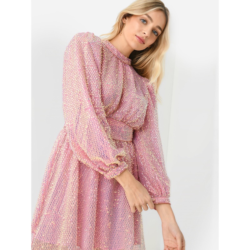 A beautiful iridescent sequin mini dress with blouson sleeves and a flattering cinched waist.