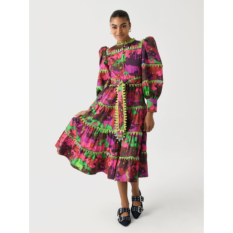 DESCRIPTION:The Hasu Dress is a stunning maxi dress with a bold floral and abstract print. It features puff sleeves, a tiered skirt, and intricate trim detailing. The detachable belt adds a touch of elegance, making this dress perfect for date nights, gard
