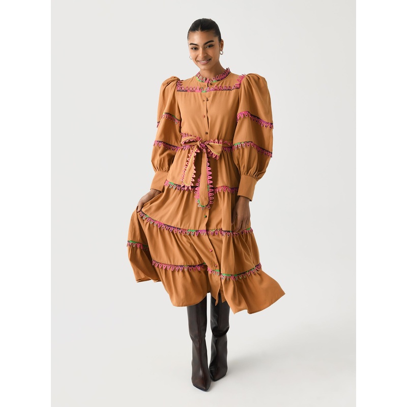 DESCRIPTION:The Hasu dress is a versatile and stylish piece for fall. The warm sandy hue and vibrant pink and green trim create a stunning contrast. The puff sleeves, tiered skirt, and detachable belt offer comfort and style, making this dress ideal for va