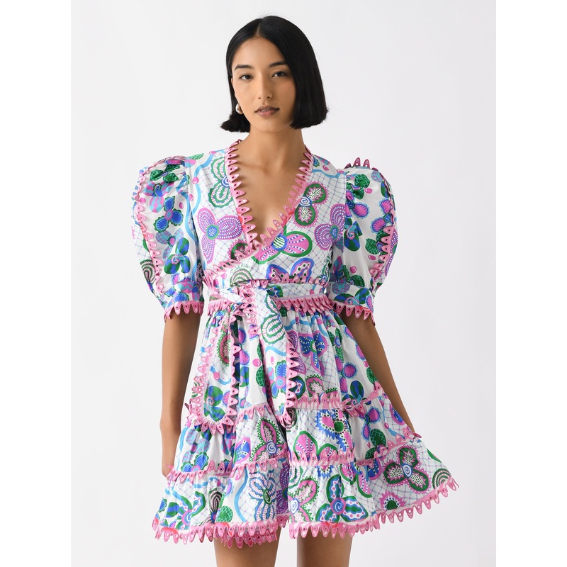 DESCRIPTION:A colorful daisy-printed mini dress adorned with scalloped trims and finished with a cinched waist and side pockets.FEATURES:V-NecklineHalf-Length Puff SleevesSide Zip ClosureSelf-Tie BeltSide PocketsTiered SkirtScalloped TrimsMini SilhouetteAl