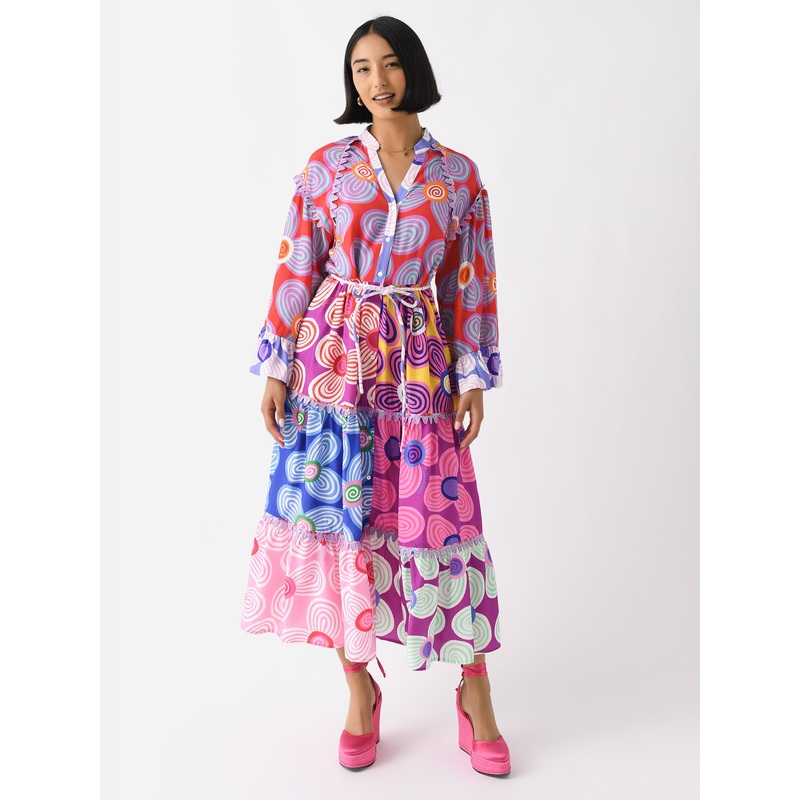 DESCRIPTION:A kimono-style dress with an easy-fitting flowy design and a colorful daisy print.FEATURES:V-NecklineWide SleevesRuffle CuffsButton-Down FrontSelf-Tie BeltSide PocketsTiered SeamsScalloped TrimsMidi SilhouetteAll-Over Novelty Print60% Viscose,