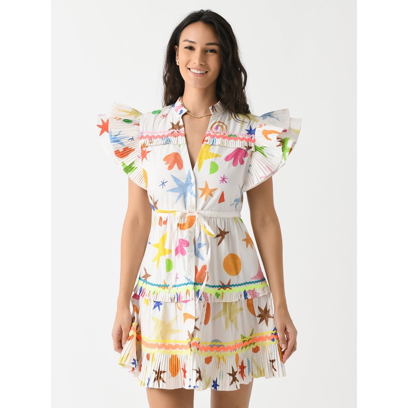 DESCRIPTION:An elevated shirtdress with flutter sleeves, pleated details, and a colorful abstract print.FEATURES:Ruffle CollarV-NecklineFlutter SleevesButton-Down FrontDrawstring WaistTiered SkirtMini SilhouetteAll-Over Novelty Print72% Cotton, 25% Recycle