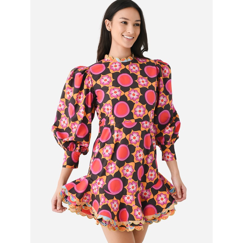 DESCRIPTION:A bold-printed floral mini dress with a removable belt and scalloped trim detailing.FEATURES:Round NecklineBack Zip ClosurePuff SleevesSelf-Tie BeltRuffle HemScalloped TrimAll-Over Novelty Print97% Cotton, 3% SpandexClassic FitModel is wearing
