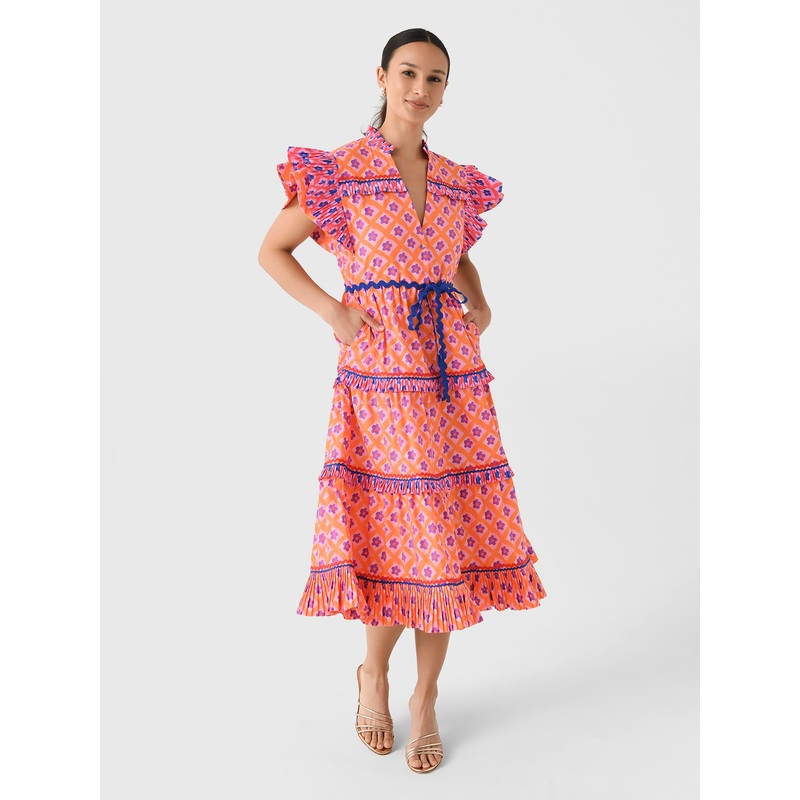 A mid-length dress made from a comfortable cotton blend with a floral print, flutter sleeves, pleated ruffle trims, and an adjustable drawstring waist.