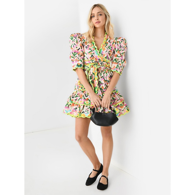 DESCRIPTION:A colorful printed mini dress featuring puff sleeves, a self-tie belt, and scalloped edges.FEATURES:V-NecklineHalf-Length Puff SleevesSelf-Tie BeltScalloped EdgesTiered SkirtAll-Over Novelty Print72% Cotton, 25% Recycled Cotton, 3% SpandexClass