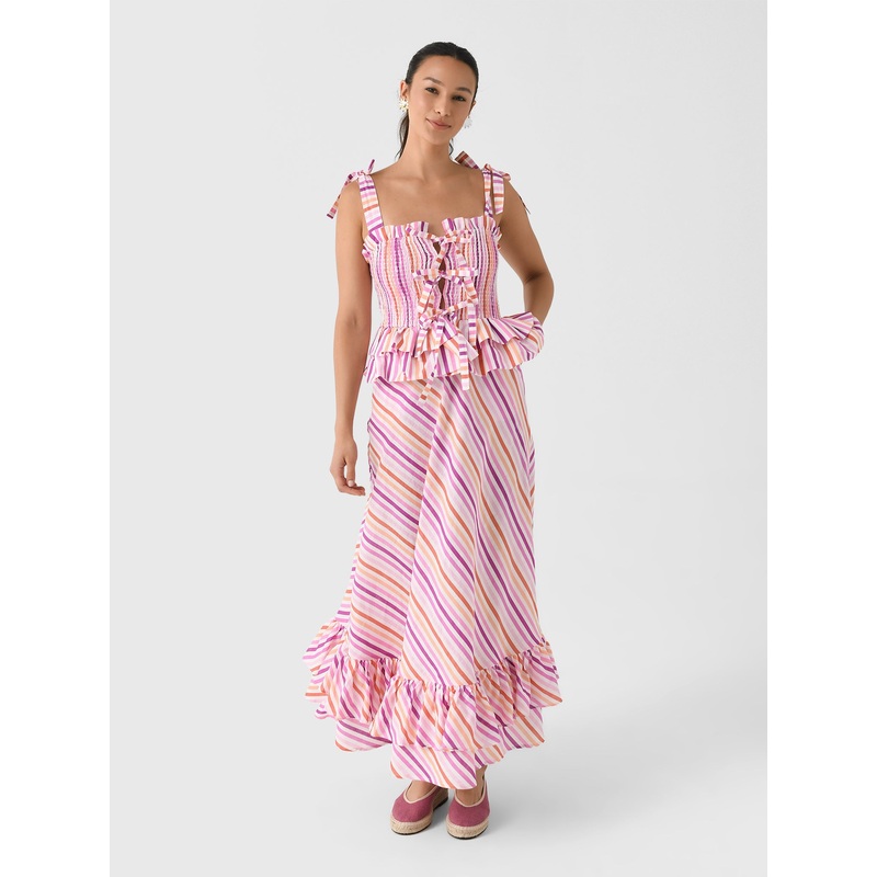 A flattering maxi dress featuring a smocked bodice, self-tie details, frilly ruffles, and a multi-colored candy stripe print.