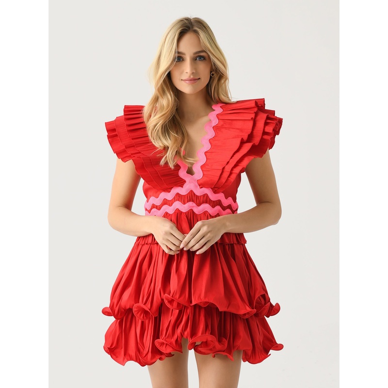 DESCRIPTION:This stand-out dress features a pleated design with voluminous sleeves, a layered flounce skirt, and contrasting ric-rac trims.FEATURES:V-NecklineBack Tie ClosureLayered Pleated SleevesBack Skirt Zip ClosureTiered Flounce SkirtContrast Ric-Rac