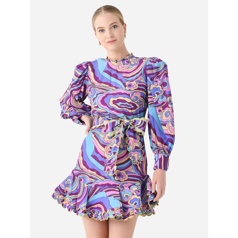 DESCRIPTION:Puff sleeve mini dress featuring scalloped trim detailing and a bold print.FEATURES:High Neckline3/4 Length Puff SleeveButton CuffsSelf-Tie BeltFlounce HemScalloped TrimMini SilhouetteAll-Over Novelty Print60% Viscose, 40% RayonClassic FitModel