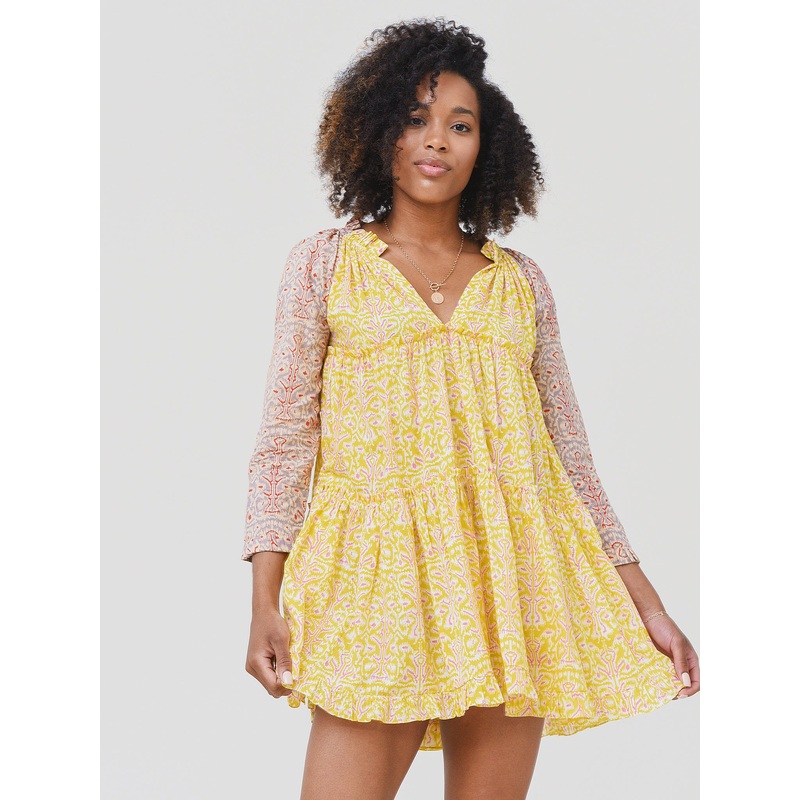 DESCRIPTION:Floral-printed mini dress with a 3/4 sleeve.FEATURES:Mini DressV Neckline with a Gathered Collar3/4 SleeveLightweightTiered SkirtAll-Over Novelty Floral PrintClassic Fit100% CottonModel is wearing size Small mini dress.Model's Measurements: Hei