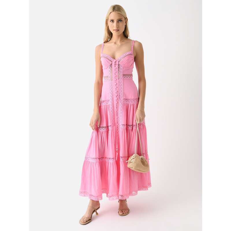 DESCRIPTION:This long, feminine dress features a gathered voile bodice, delicate inset lace, and circular embroidery details throughout.FEATURES:V-NecklineThin, Fixed StrapsSmocked BackButton-Down FrontInset Lace DetailsCircular EmbroideryTiered SeamsMaxi